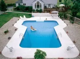 The Tee Swimming Pool has a horizontal rectangle shallow end making it look like the letter “T”. The Tee inground swimming pool design maximizes all of your potential shallow area by extending both sides. This swimming pool takes up a lot of room and you must have a larger backyard to accommodate the amount of water that this pool will give you. It’s an ideal pool for those with families and younger children. We offer a variety of T-shaped pool dimensions for you to choose from, and customization is always encouraged.